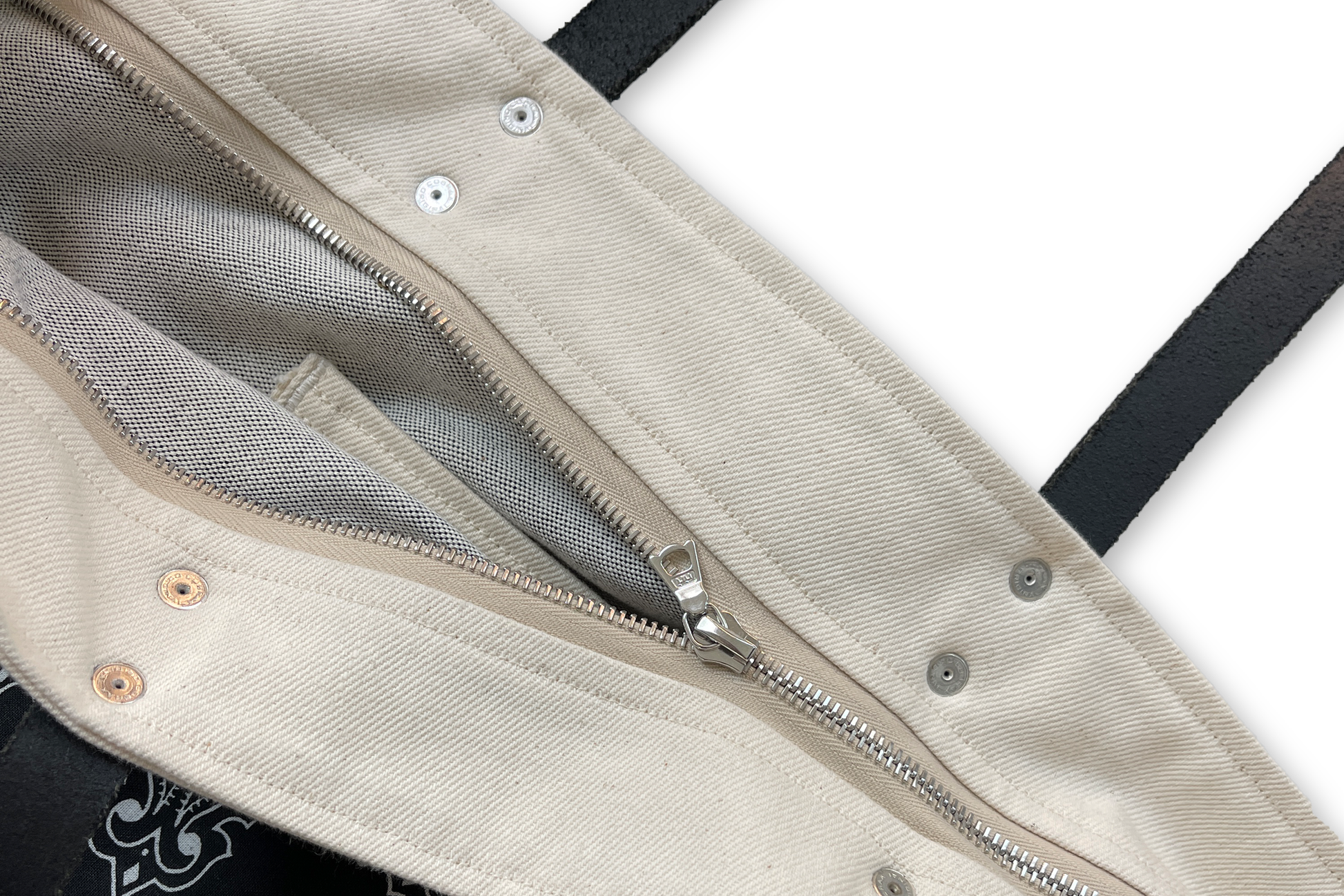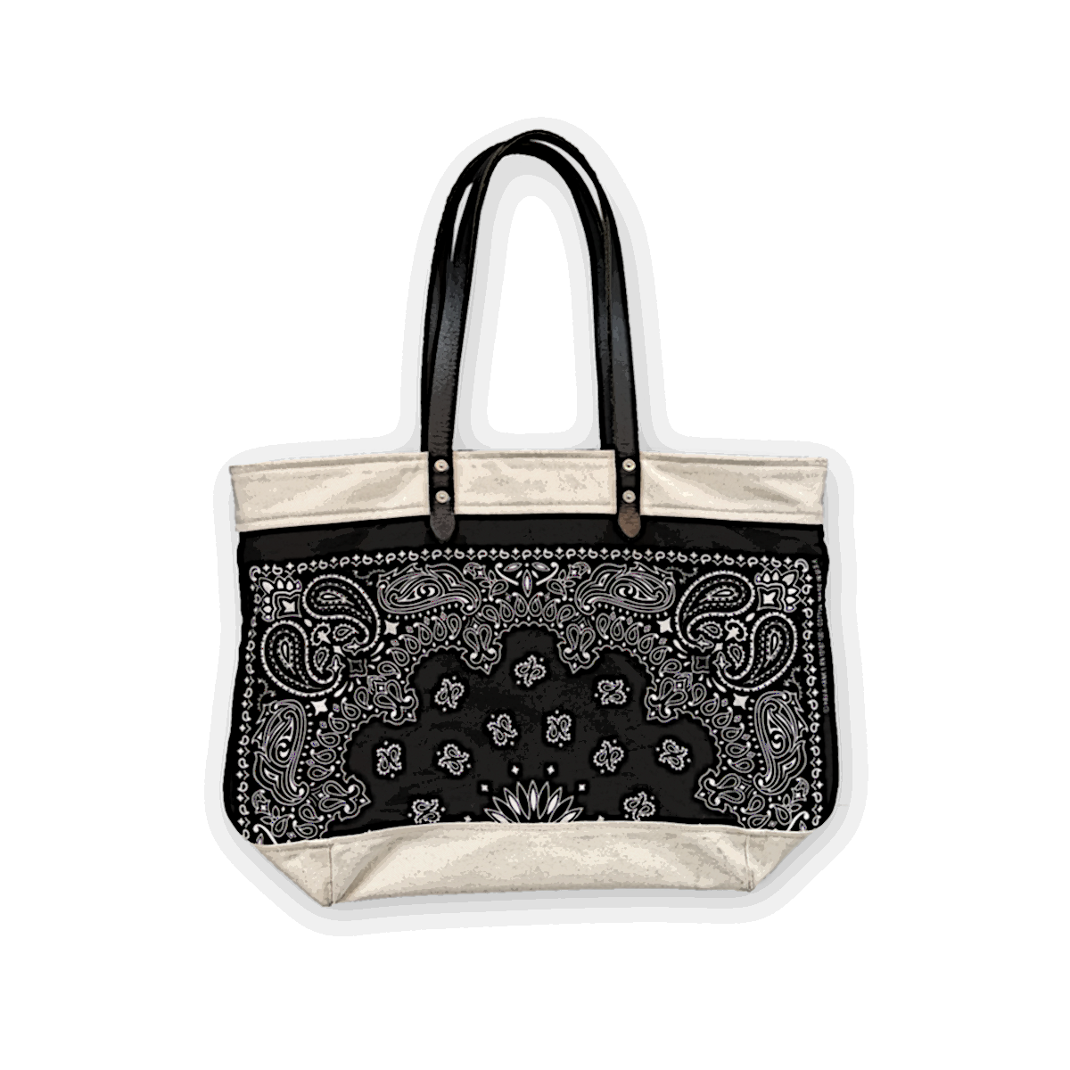 Constructed out of a USA made bandana and veg tanned leather for the handles. Featuring a RiRi zipper closure and an interior pocket for smaller items. “Papa’s old hanky, now more useful than just a snot receptacle.”