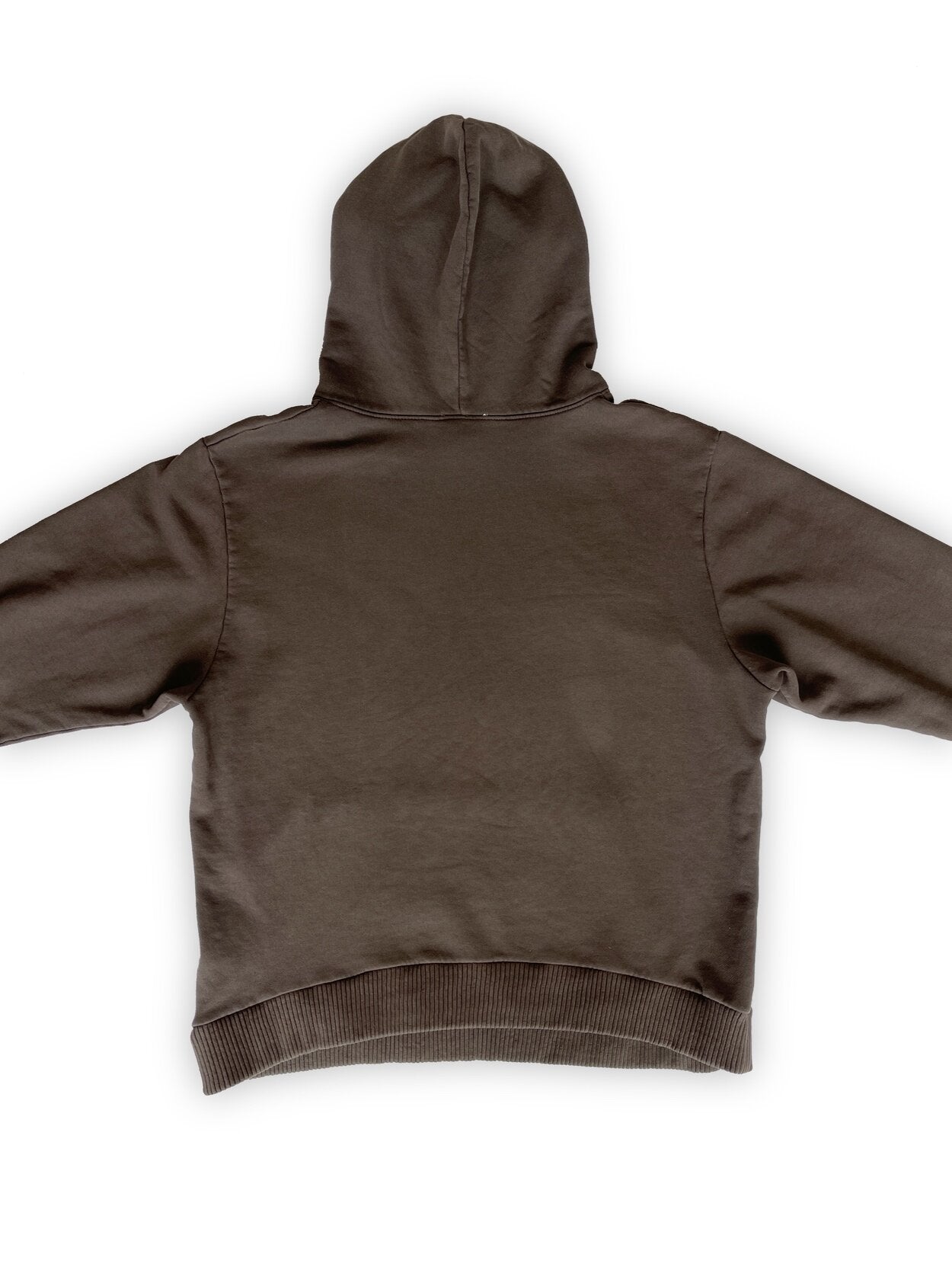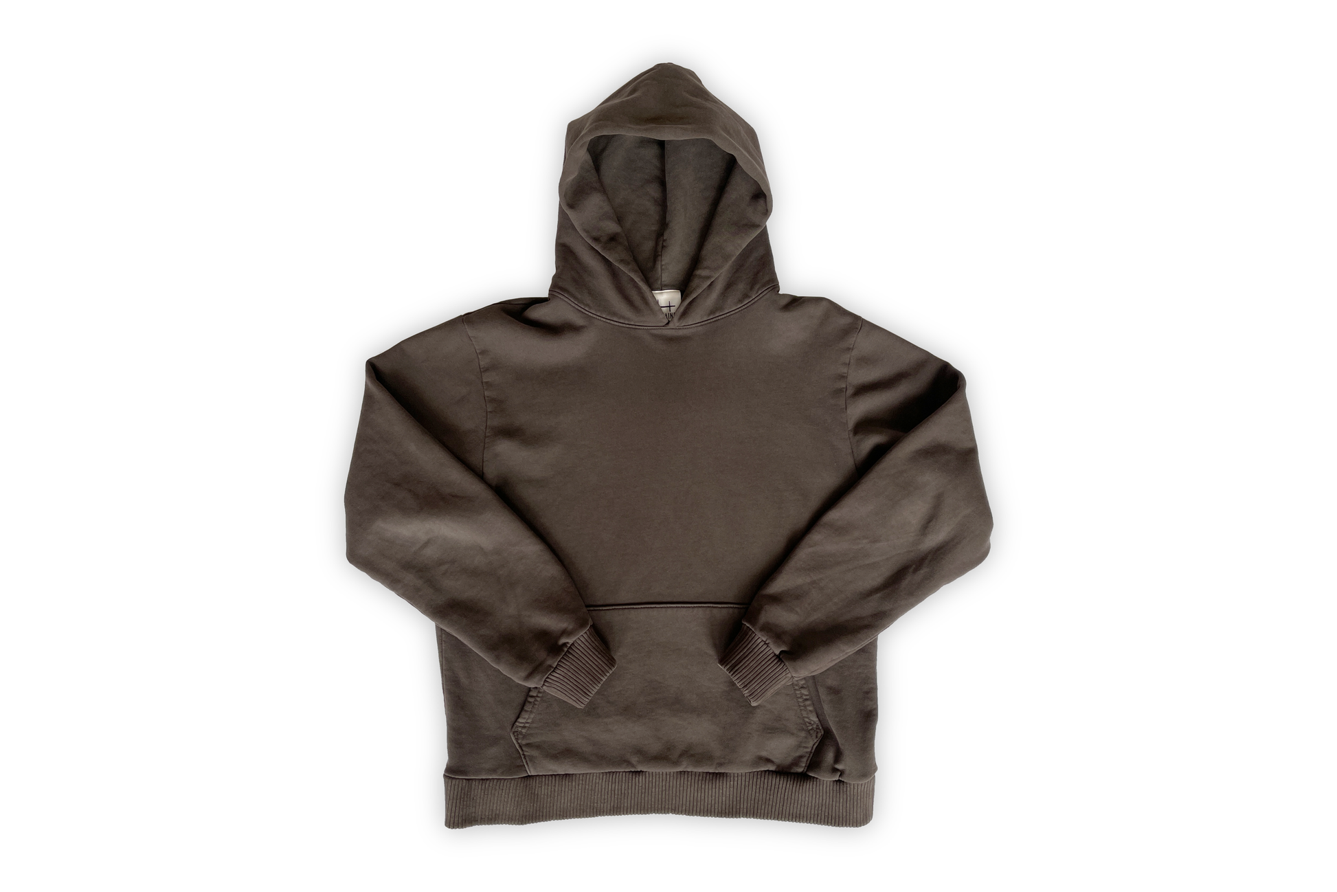 Heavyweight hoodie with an oversized, unisex, fit. Garment dyed and washed for a soft “broken-in” feel. Featuring a distinctly chunky rib trim and uneven hem that raises in the back. “Feels like a real bear hug, minus the claws.”