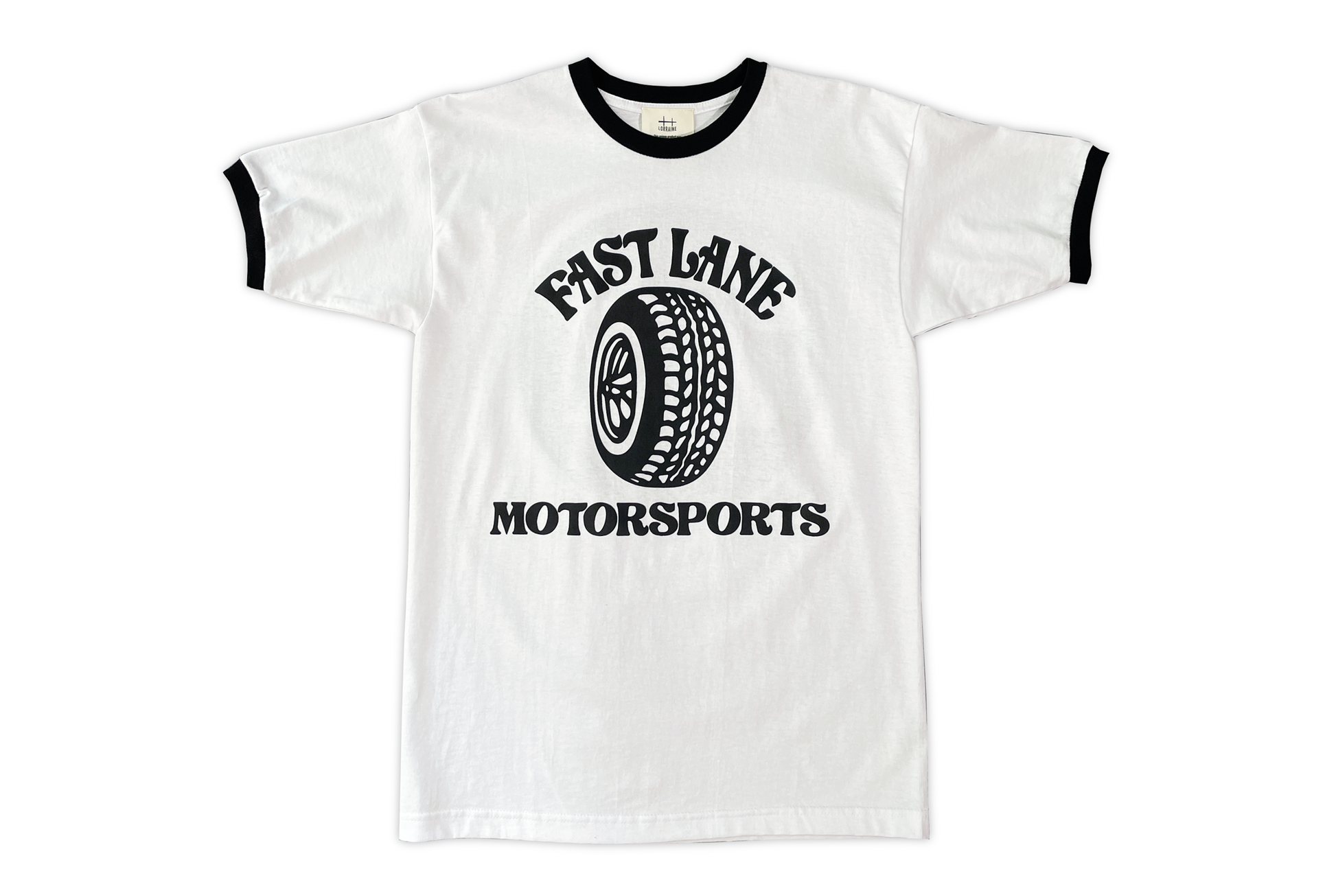 Medium weight cotton short sleeve ringer shirt. Good for wearing tucked or untucked. Pure white body with black ribbing at neck and sleeves. Featuring an oversized front and back screen print for maximum visual aesthetic. "Go out and get this one dirty, no time to waste!"
