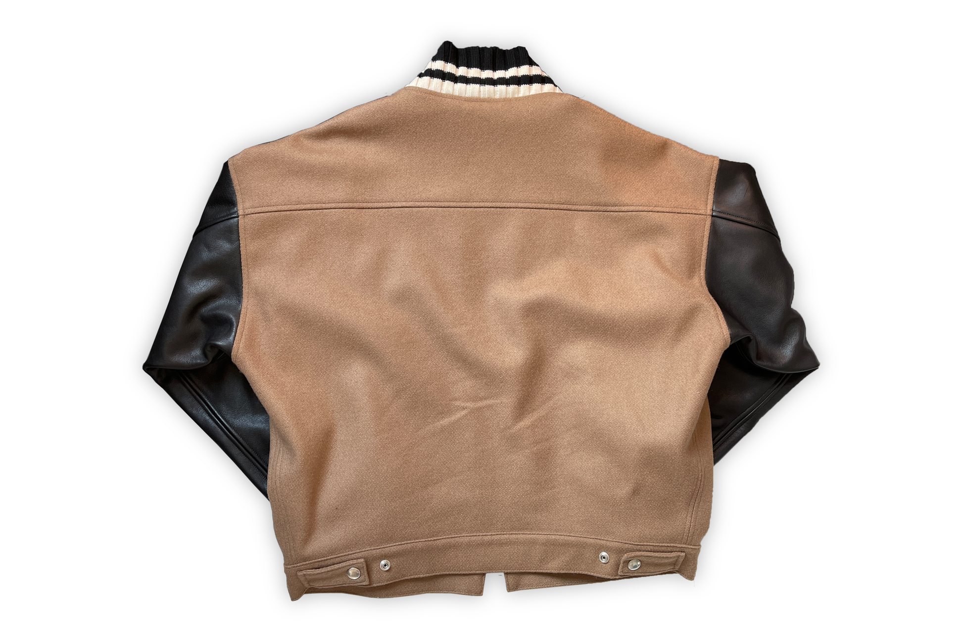 Oversized varsity style jacket featuring a custom knit shawl collar and matching cuffs. Body is 100% melton wool with Italian cowhide leather sleeves and trim. Inside is a silk/cotton blend lining with two interior bust pockets and a locker loop at the neck. ”The most stylish way to warm the bench.”